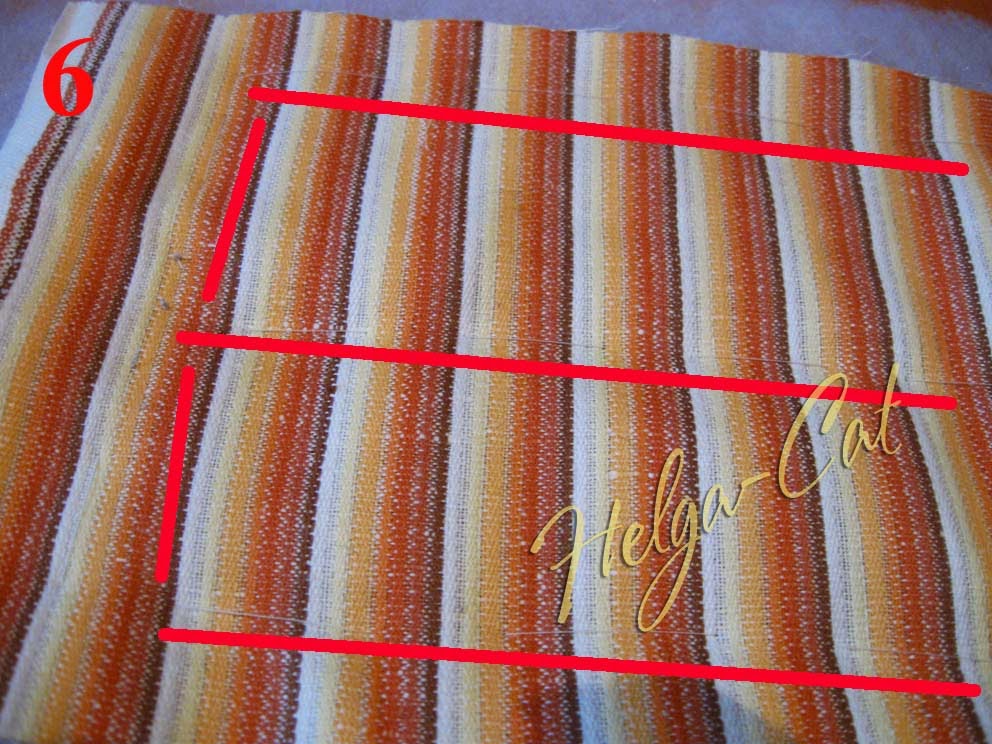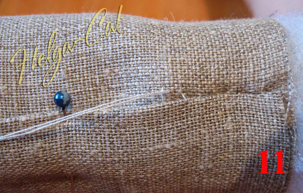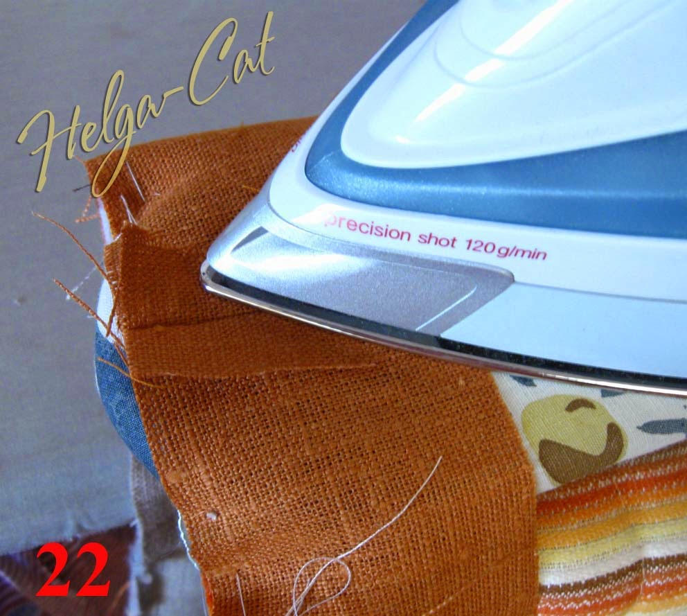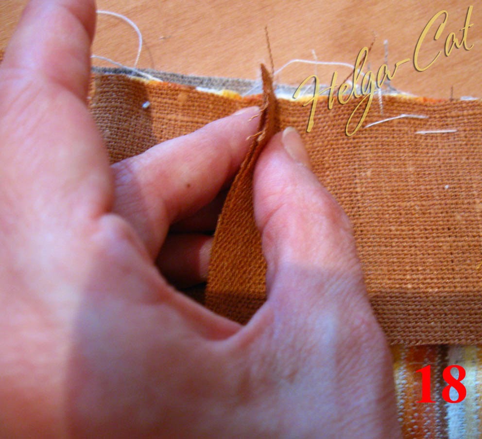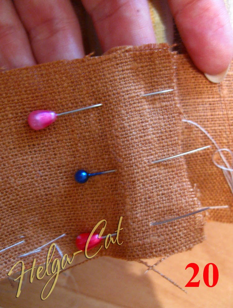 23. Приметать отделочную полоску до конца к верхнему краю основы. У меня получилось два шовчика, потому что размер коричневой ткани уже не позволят выкроить одну полоску необходимой длины, пришлось добавлять кусочками.