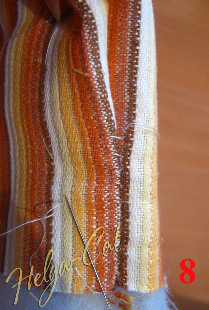 8. Загнуть припуск наружной ткани с одной стороны заготовки наизнанку, наложить его на линию шва и пришить потайным швом. У меня удачно совпали полоски на ткани – шва практически не видно. Если у вас ткань с рисунком, вы можете изначально подогнать размер окружности под раппорт узора, чтобы всё красиво с;остыковалось.