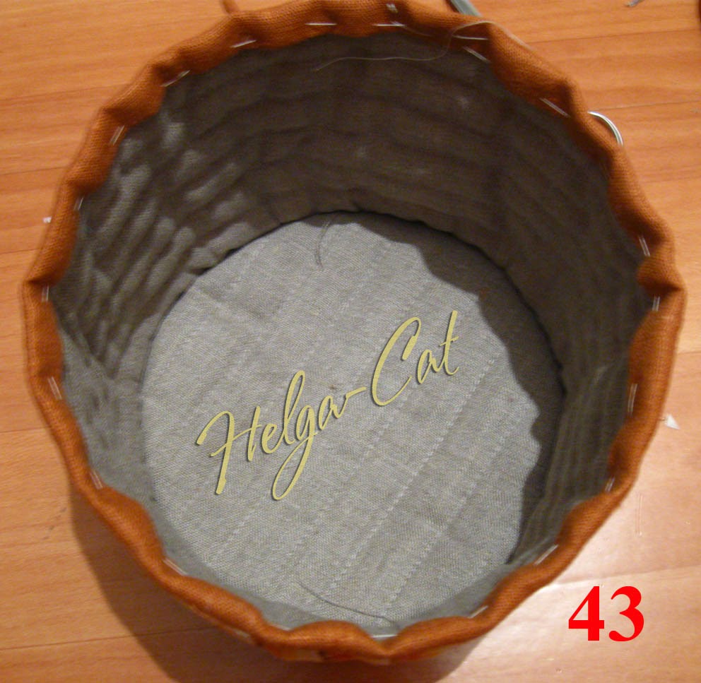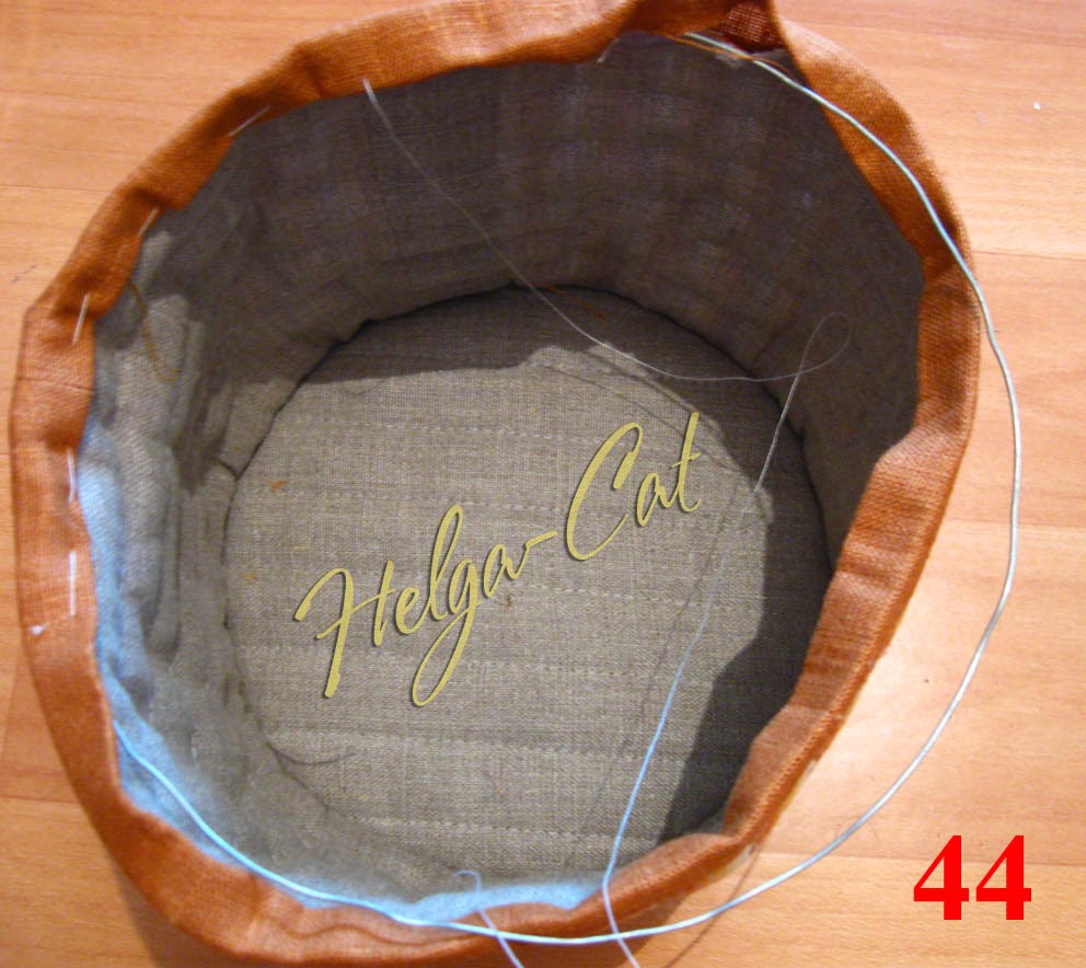 44. Мне показалось, что у меня верх коробочки мягковат, я нашла проволочку – тонкую, не слишком жёсткую, но вполне упругую, отпорола верхнюю намётку отделки (её можно чуть прогладить заранее, пока смётанная, чтобы форму держала и было проще вшивать проволоку).