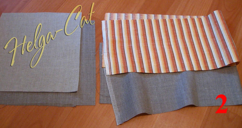 Для шитья коробки я выбрала полосатый коричнево-жёлтый лён для наружной стенки, серый лён для внутренних стенки и донышка и светло-серый лён для наружного донышка. Для окантовки – коричневый лён.