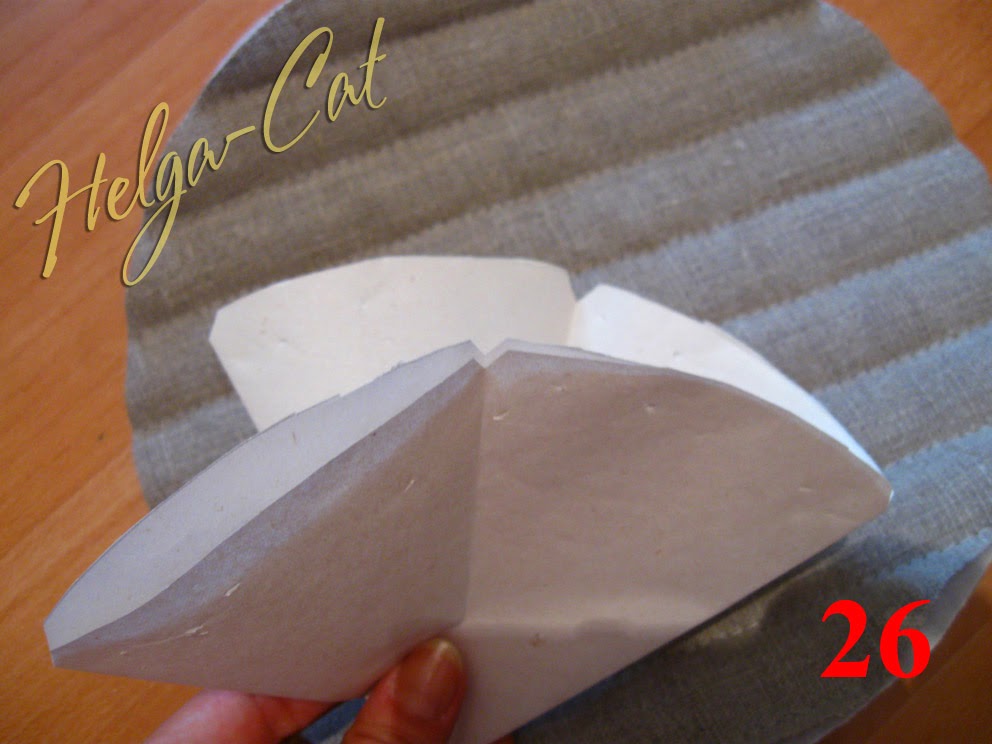 27. Положить выкройку на донышко с наружной стороны и по всем прорезанным уголкам поставить метки карандашом или исчезающим маркером.