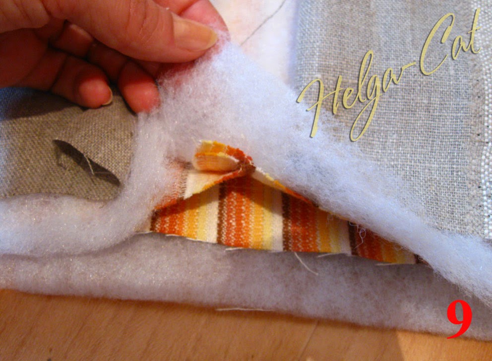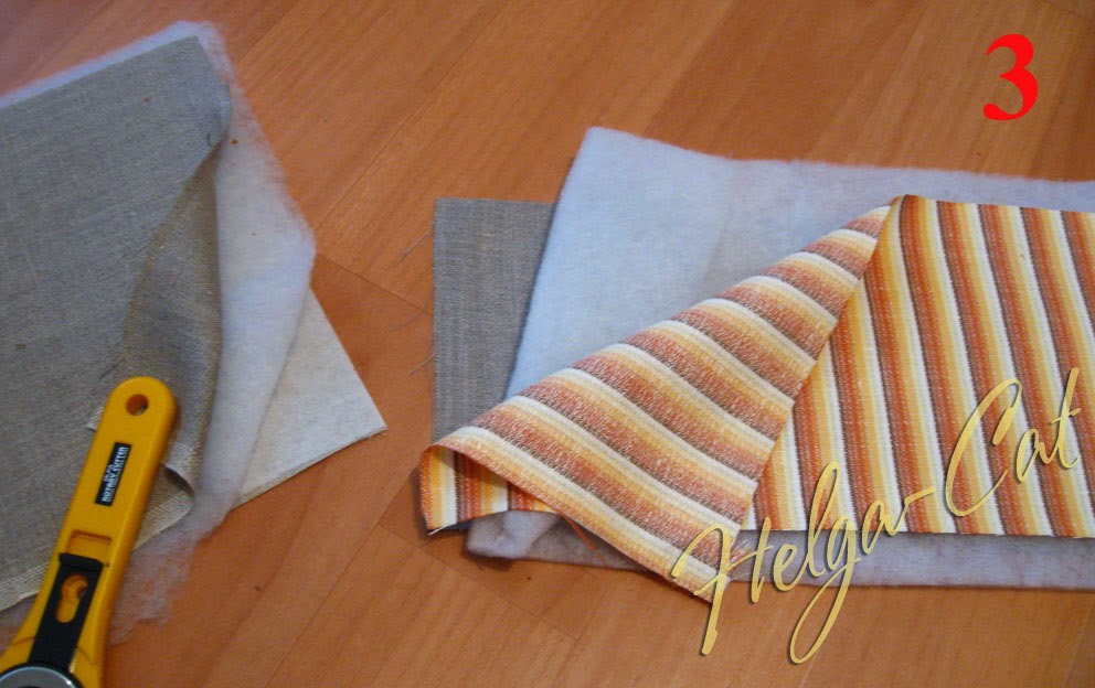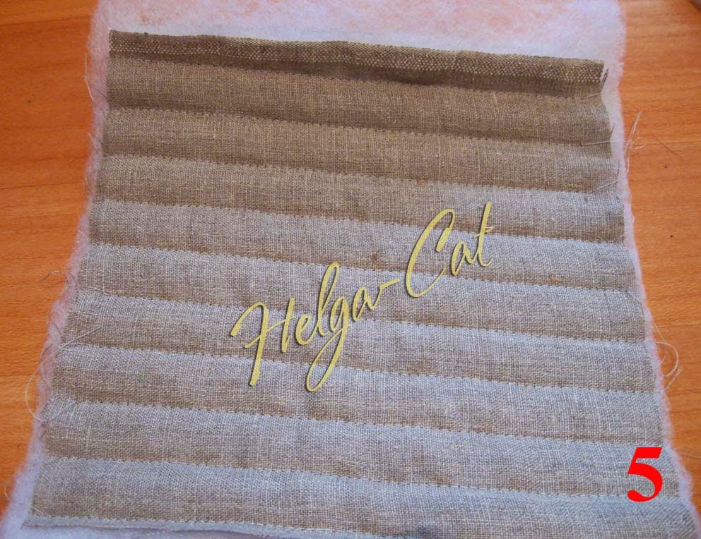 - для донышка – наружная ткань лицевой стороной вниз, флизелином вверх, синтепон, внутренняя ткань лицевой стороной вверх (у меня лён с обеих сторон одинаковый, для него некритично, но если у вас ткань с набивным рисунком, то рисунком наверх);
