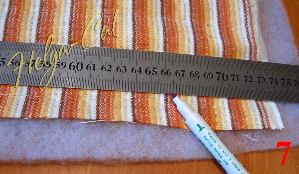 7. Отступить от одного короткого края заготовки 1 см для припуска на шов и от него отмерить 66 см – длину окружности в готовом виде. Я выкраивала длину с небольшим запасом (на всякий случай))), поэтому излишки я потом срезала. Отметить линию стыка краёв – линию шва.
