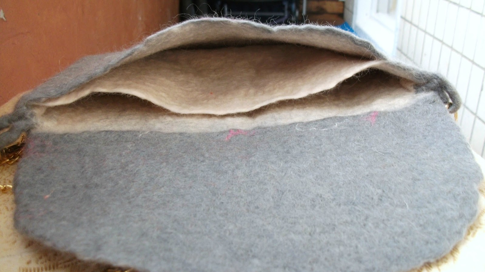 Процесс валяния в дальнейшем кому какой нравится. Я валяла и в полотенце, и мочила в холодной и горячей воде поочередно. Немного валяла и массажем. Очень тяжелая попалась шерсть, никак не хотела сваливаться. В итоге получился клатч вот такой внутри: