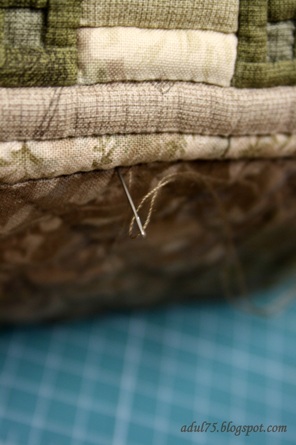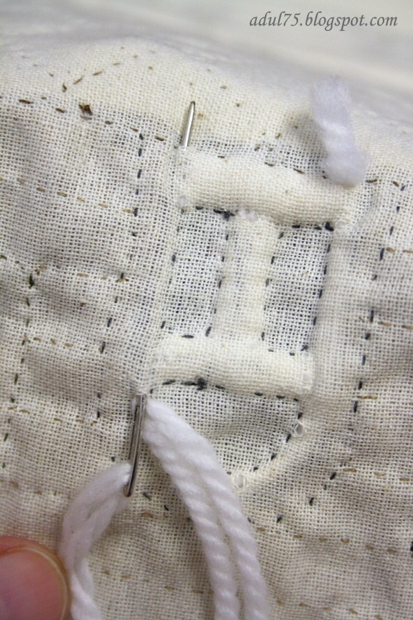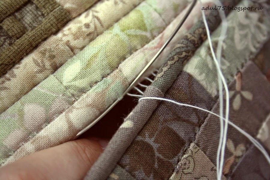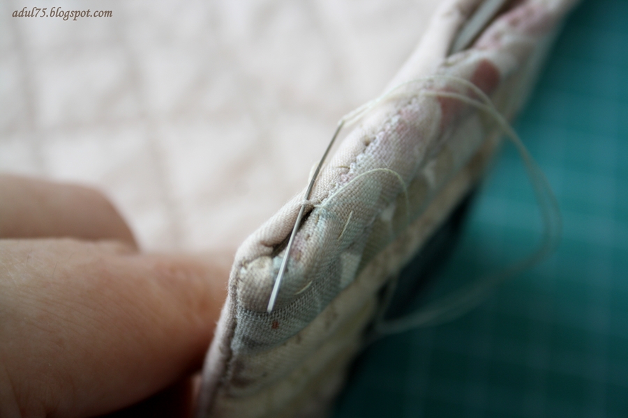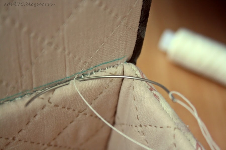 Для крепости я прошила и снаружи и изнутри. Самое главное, что отрезок, который надо прошить этой иглой не такой уж и большой, это служит хорошим утешением))) На фото еще не затянутые стежки, прошейте сначала со свободной нитью, в конце сильно потяните.
