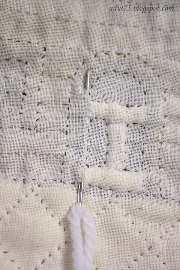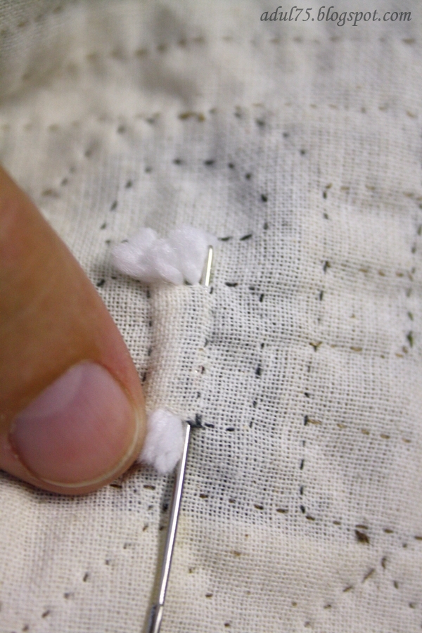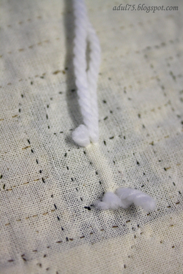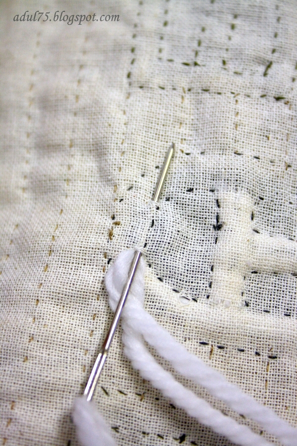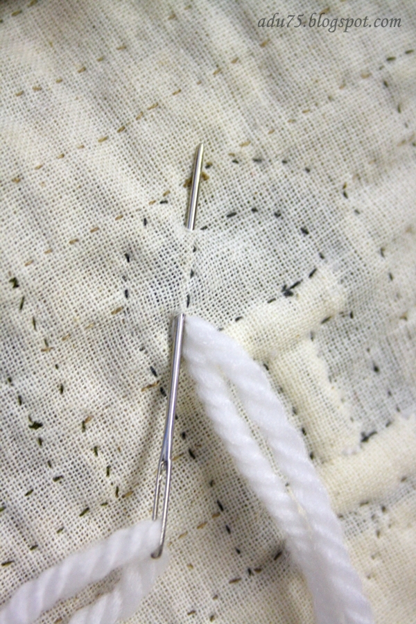 Наша задача уложить шерстяную нить рядами, заполнив пространство между слоев ткани. Начинаем рядом со стежкой.
