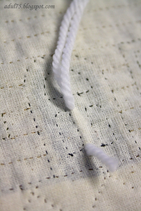 И толстые вязальные нитки. Я использую шерсть, потому что эта нить как бы "худеет" когда ее продеваешь в дурочку и снова "толстеет" когда ложится внутри.