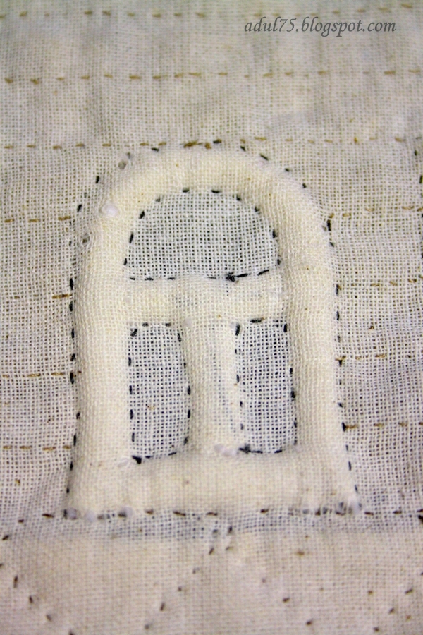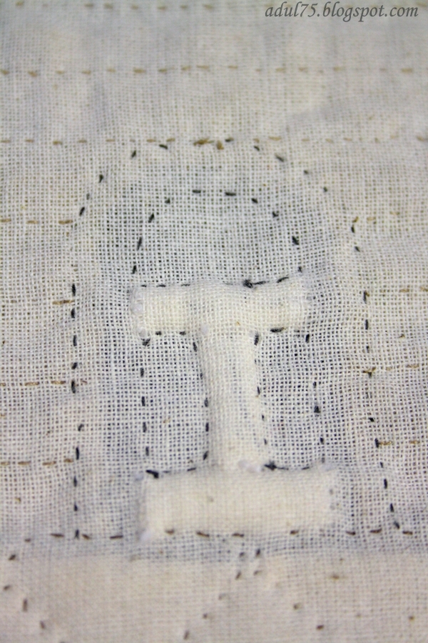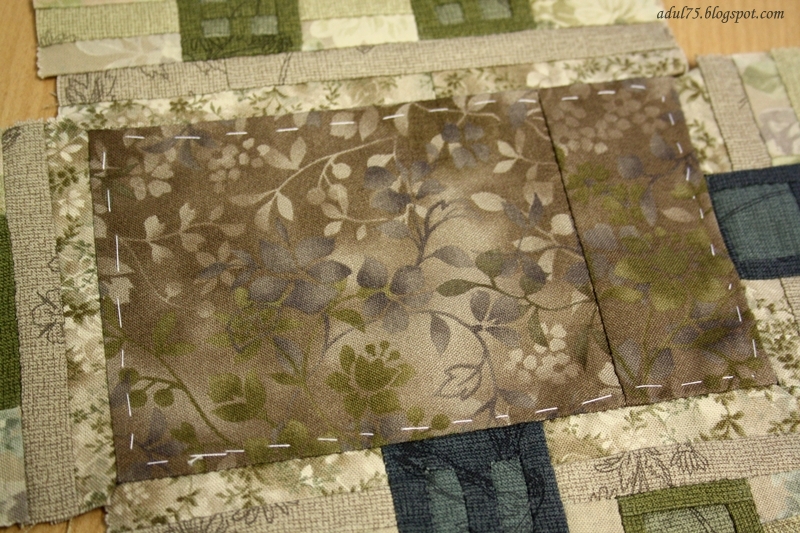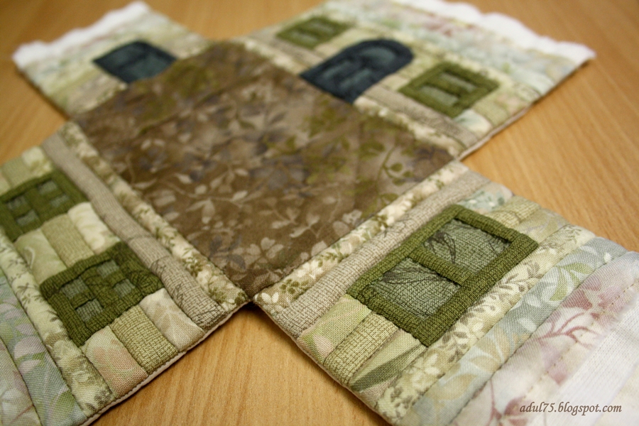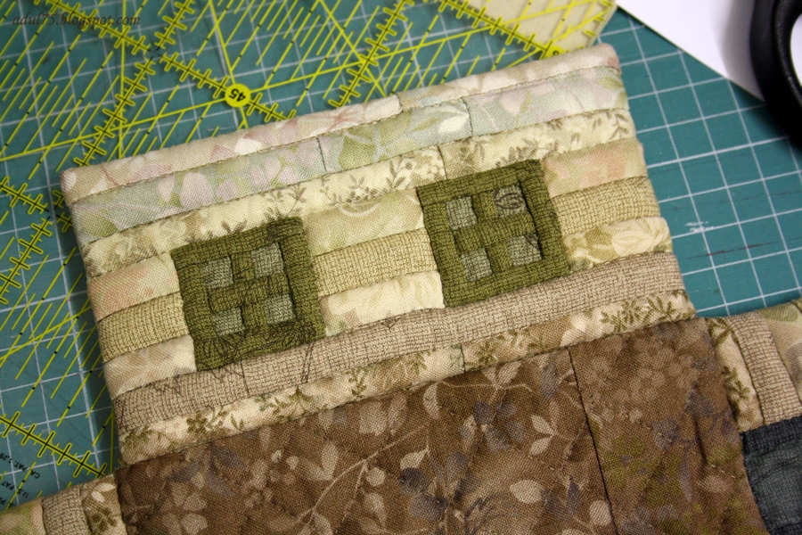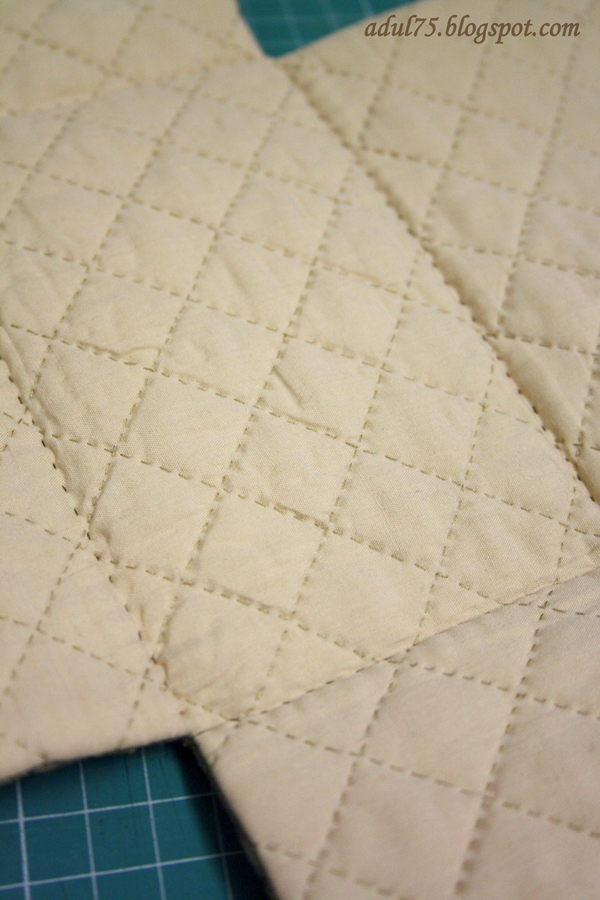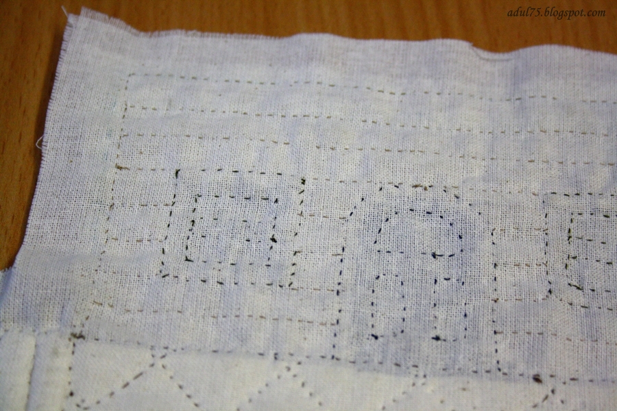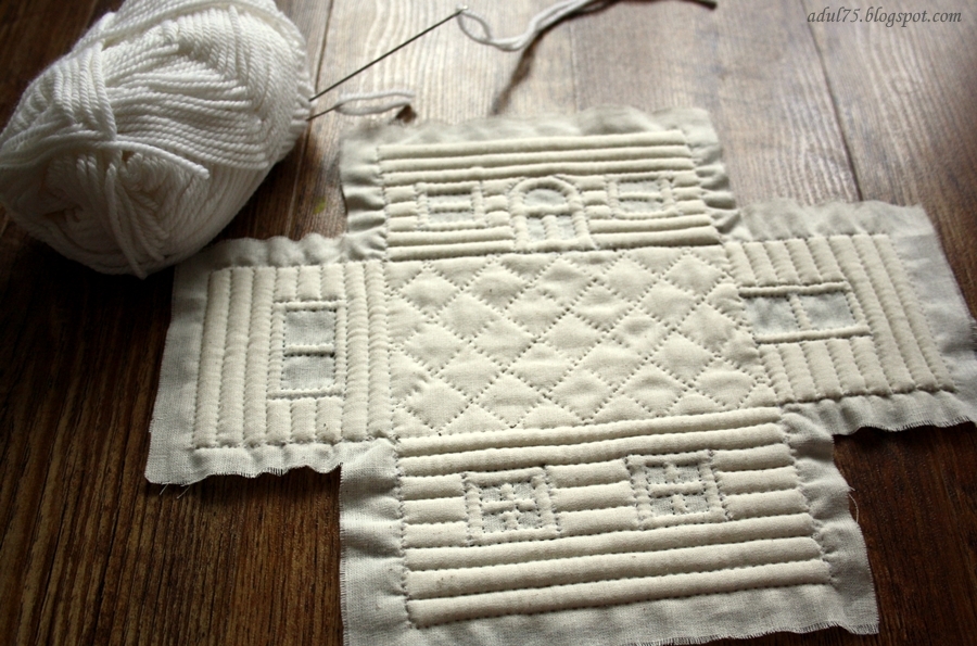Берем простеганные детали крыши и отмечаем припуски. Так как разметка понадобится с обих сторон, я сделала ее ниткой, а не карандашом.