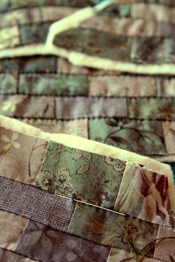 Вырезаем бейку, которой будет обработан край крыши. У меня ткань кусочками, поэтому бейка составная. Пришиваем бейку со стороны крыши, а не дна. Следите за тем, чтобы шов ложился точно по линии и стежки желательно делать помельче)