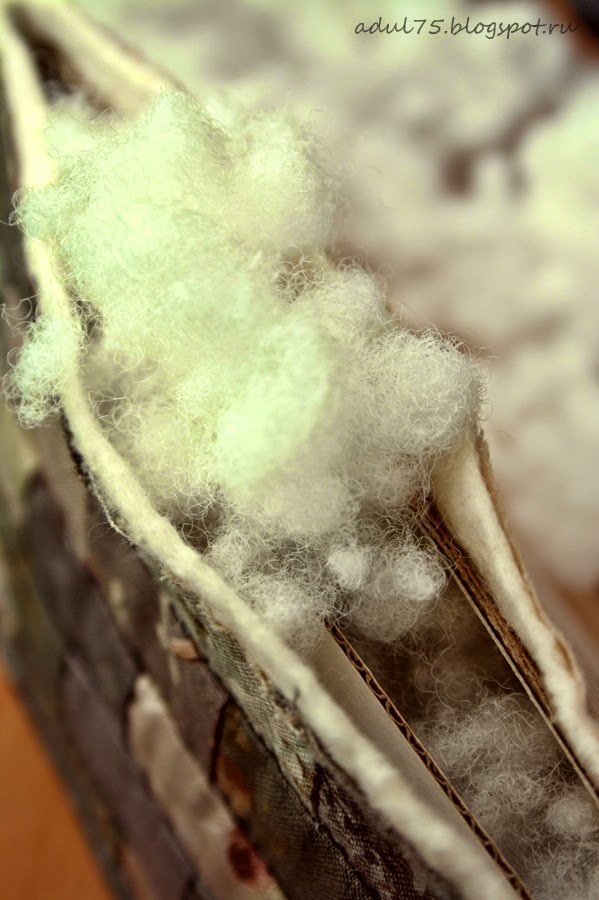 Теперь у вас два пути, сделать так как в оригинале (смотри фото в конце поста) или пойти со мной, но этот путь труднее. я объясню почему решила делать по своему. Детали крыши мягкие, хоть и простеганные и после сборки крыши при ее набивке, она распухла бы как шарик и потеряла форму, чтобы этого не случилось, надо было бы или набивать чуть-чуть (а я не люблю когда внутри много пустых мест, что в итоге все равно привело бы к деформации) или укреплять стенки каким-то образом. Я выбрала укрепление.