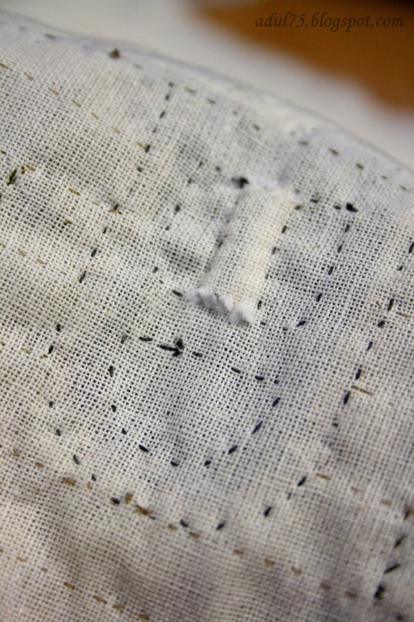 Следите за тем, чтобы шов от бутиса (который мы прошивали по периметру), получался внутри, когда вы зашиваете. И еще, посоветую начинать от середины и двигаться к углам. Так вам будет легче начать и проще закончить))))