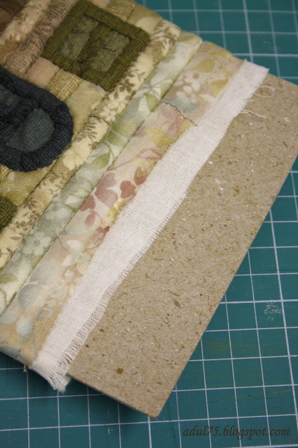 После того, как картон закреплен, сшиваем верхнее ребро крыши. Оказалось, что я забыла сфотографировать этот этап, но тут ничего сложного. складываем припуски вместе, подрезаем их до 4-5 мм и обшитваем их бейкой. См на фото выше.
