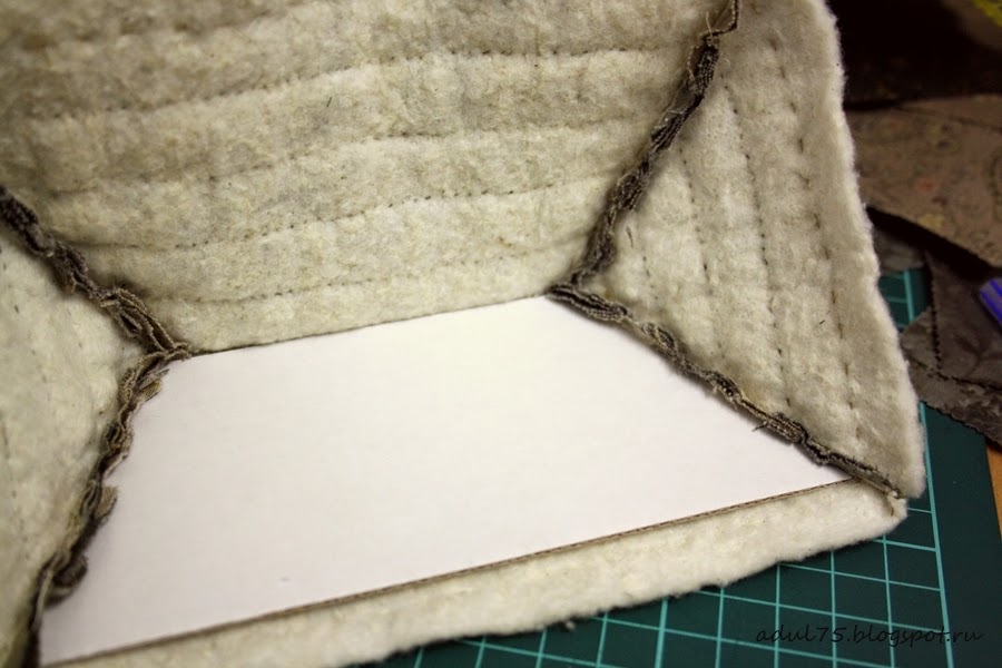 Сначала я зашила внутрь простой прямоугольник, но в тех местах, где по бокам загибается верхний припуск, получается слишком толстый слой. Поэтому пришлось распороть шов, срезать картонку по углам, а также срезать под углом припуск ткани в верхней части. Таким образом, в готовом виде стенка получилась прямой по бокам, а не расширялась в верхней части.