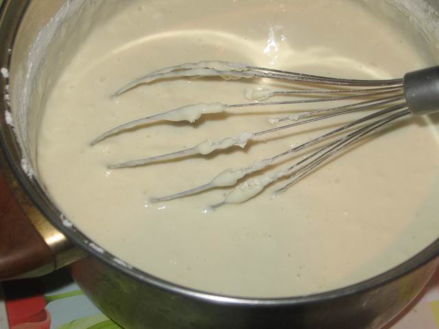 Не дожидаясь, пока дрожжи проснутся, начинаем замешивать тесто. Муку добавляем постепенно. Тесто должно получиться не слишком густым. Гуще, чем густая сметана, но не слишком. С ложки оно должно отрываться, но не литься. Стараемся замешивать без комочков. В этом нам поможет венчик или миксер.