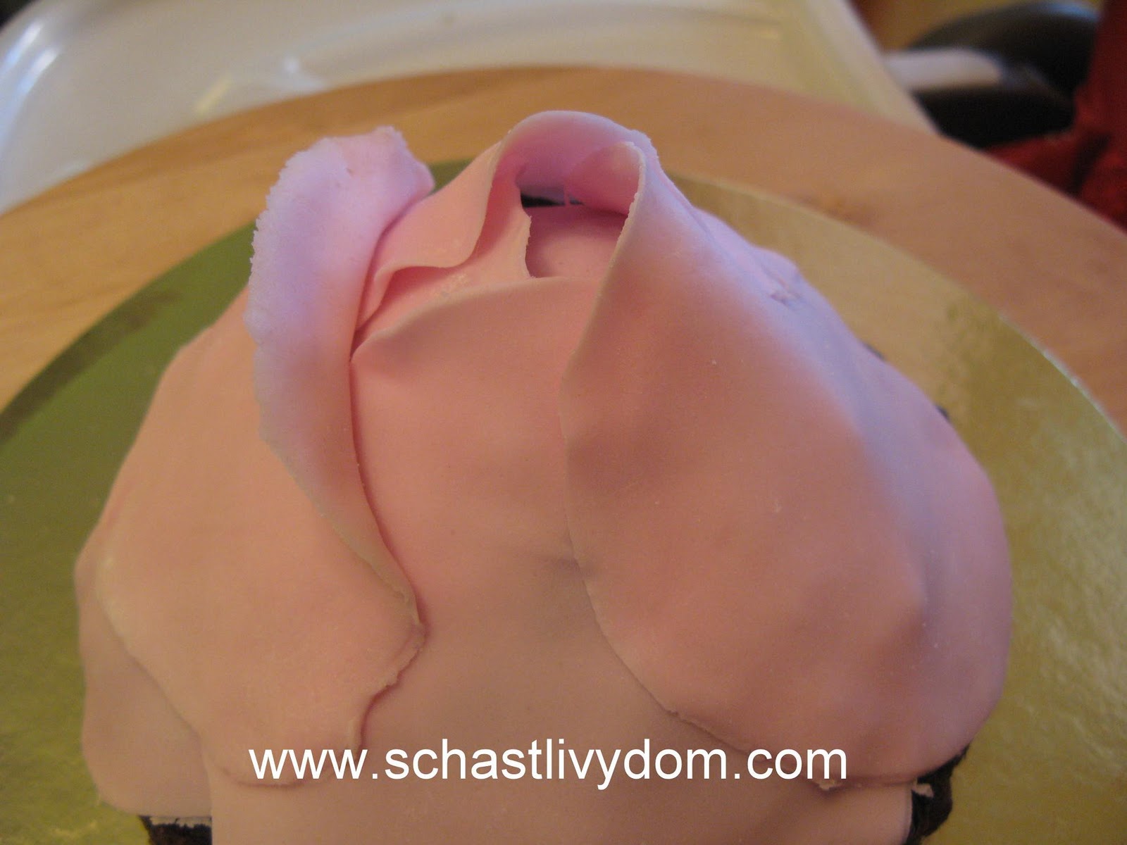 Начинаем сверху. Накладываем на верхушку конуса небольшой круглый кусочек мастики. Затем накладываем первые лепестки, которые не загибаем. У меня их было 3.