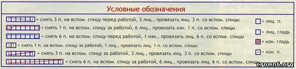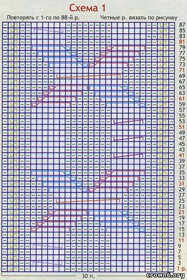 Основной узор: вязать по схеме, на которой приведены только лиц. р., в изн. р. все петли вязать изн. Повторять с 1-го по 56-й р. 1 клетка = 1 п. и 2 р.