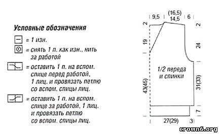 Перед. Вязать, как спинку. На высоте 41 см закрыть для пройм с обеих сторон 5 п., в каждом 2-м р. 4 п., 2 п. и 1 п. Одновременно, для V-образного выреза горловины, снять на булавку среднюю п. и вязать обе стороны отдельно, убавляя в каждом 2-м р. 14 раз по 1 п. На общей высоте 65 см закрыть по 30 п. для каждого плеча и закончить вязание.