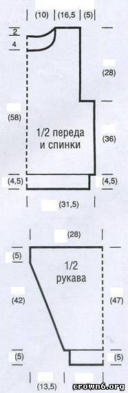 На высоте 62 (64) см закрыть для скоса плеча с правой стороны в каждом 2-м р. 3 х 8 и 1 х 9 п. (3 x 9 и 1 х 10 п.). Симметрично закончить другую половину.