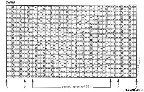 Затем вязать основным узором следующим образом: кром., начать от стрелки А (В), повторить 4 раза раппорт, закончить у стрелки С (D), кром. На высоте 38 (40) см закрыть для пройм с обеих сторон в каждом 2-м р. 1 х 3, 2 х 2 и 3 х 1 п. и в каждом 4-м р. 3 х 1 п.