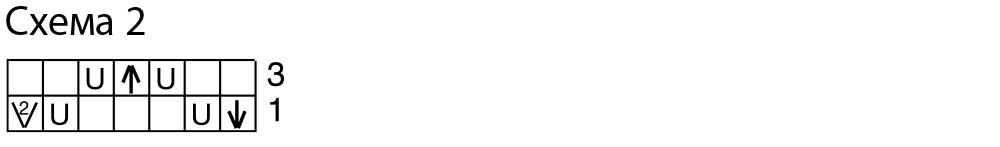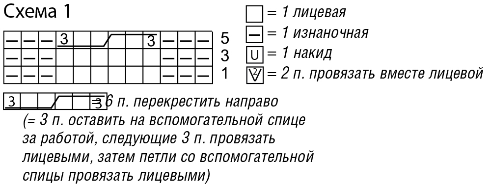Вязать согл. схеме 1. На ней даны лицевые ряды. В изнаночных рядах петли провязывать по рисунку. Постоянно повторять 1—6-й ряды.