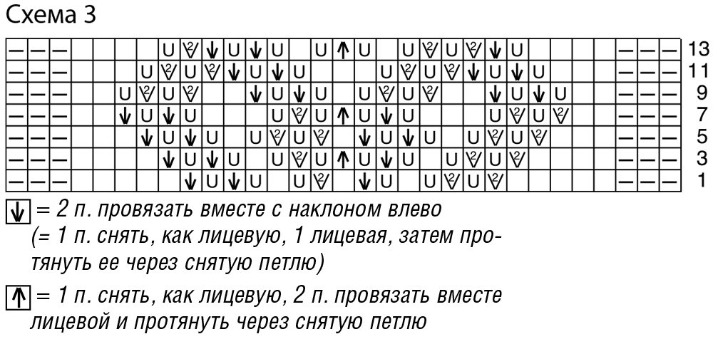 Вязать согл. схеме 3. На ней даны лицевые ряды. В изнаночных рядах петли провязывать по рисунку, накиды провязывать изнаночными. Постоянно повторять 1—14-й ряды.