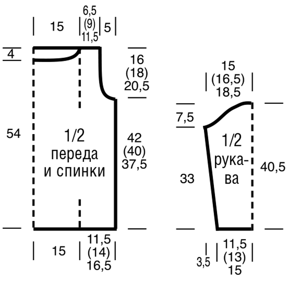 Вязать, как спинку, но через 54 см = 168 р. от начального ряда закрыть для горловины средние 27 п. и обе стороны закончить раздельно.