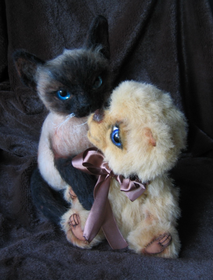 Доброго времени суток.Котик, зовут Монморанси, сидя рост-около 27 см.Свалян их шерсти нескольких оттенков,на каркасе,динамичен,может лапками махать,поднять,опустить, глазки-стекло(Германия),росписаны вручную,носик -ВОК.усы леска,акрил,тонирован маслом.Каркас--металлическая проволока, хлопок.