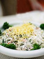 Укладываем слоями: яичные белки, порезанные вилкой,