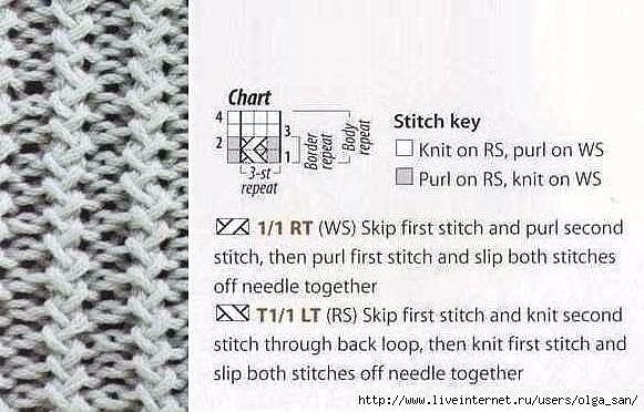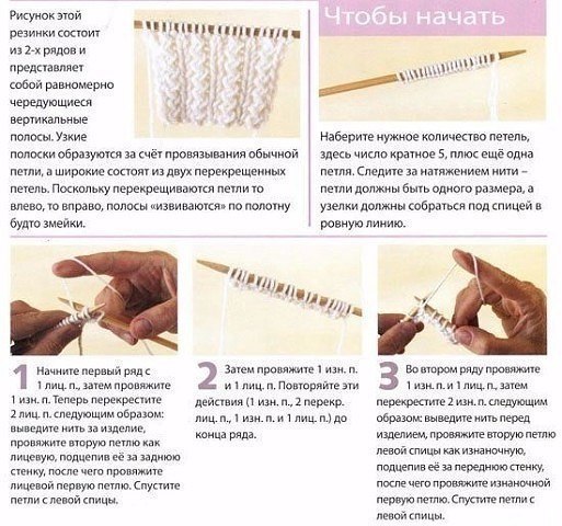 Набрать 72 п. машинным наборным рядом. Резинку вязать след. узором: 1 ряд - лиц., изн. не провязывать, перекинуть на др. спицу; 2 ряд – 2 лиц., 2 изн.; 3 ряд – 2 лиц. перекрестить и провязать, изн. п. вязать изн., провязать 69 п., спять 3 п., повернуть и вязать в др. сторону. Далее вязать укороченными рядами (в каждом ряду снимать по 3 п.). Снимать петли, пока не останется 12 п., потом все снятые петли провязать (лиц.п. вязать лиц., изн. вязать изн.), получится 72 п.