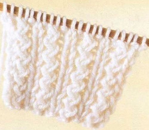 1-й ряд (лицевая сторона): *2 лицевые перемещенные петли (2-ю петлю провяжите лицевой за заднюю стенку, не снимая с левой спицы, 1-ю петлю провяжите лицевой, затем обе петли предыдущего ряда снимите с левой спицы), 2 изнаночные*.