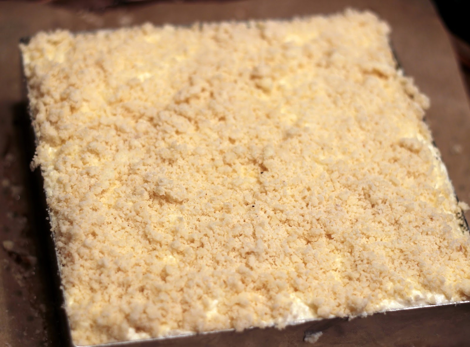 Я использовала сладкое тесто для тарта, рецепт которого можете посмотреть здесь. На квадрат без бортиков у меня ушло 150 гр этого теста. Если будете делать с бортиками, возьмите грамм 300. Вы можете использовать также любое песочное тесто, я взяла то, которое у меня часто бывает и как раз лежало в морозилке.