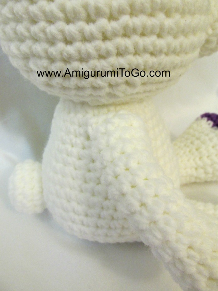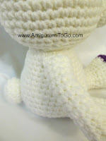 Голова и тело вяжутся одной деталью. Если Вы будете использовать глаза, которые надо закреплять изнутри, не забудьте прикрепить их между 12-ым и 13-ым рядами, расстояние между глазами – 7 сбн. Мордочку пришиваем, чтобы ее верхняя крайняя часть располагалась на 12-ом ряду.