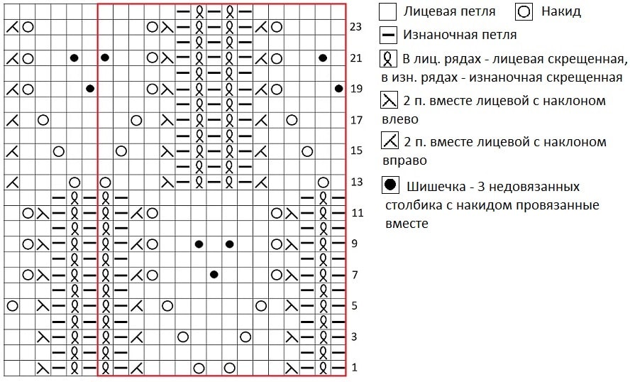 1 ряд: 1 кром, 1 изн, 1 лиц/скр, 1 изн, 2 п. вместе лиц. с наклоном влево, 3 лиц, 1 накид, 1 лиц, 1 накид, 3 лиц, 2 п. вместе лиц. с наклоном вправо, 1 изн, 1 лиц/скр, 1 кром.