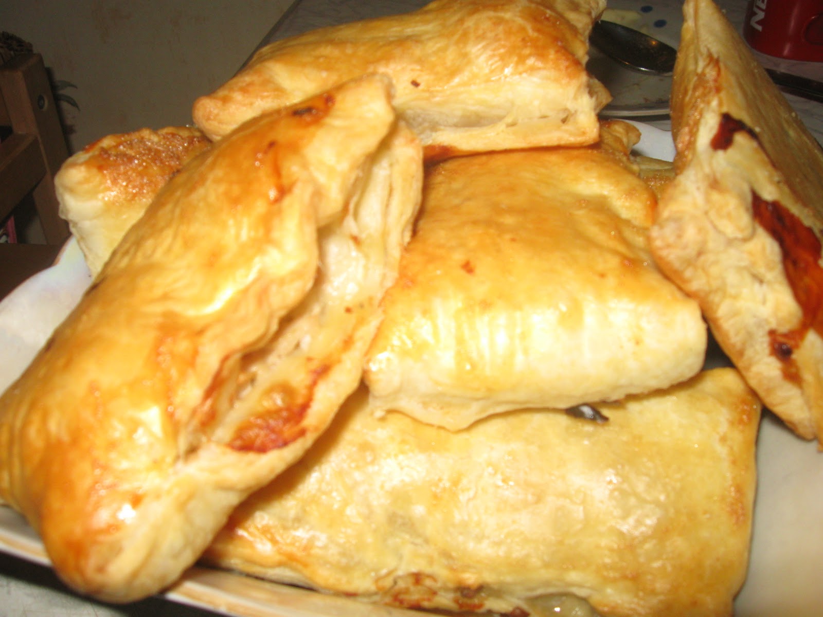 Для рецепта понадобятся: Куриное мясо примерно 250гр Свинина примерно 250гр Лук 3шт Капуста 150гр Соль, перец по вкусу Слоенное тесто 1 кг.
