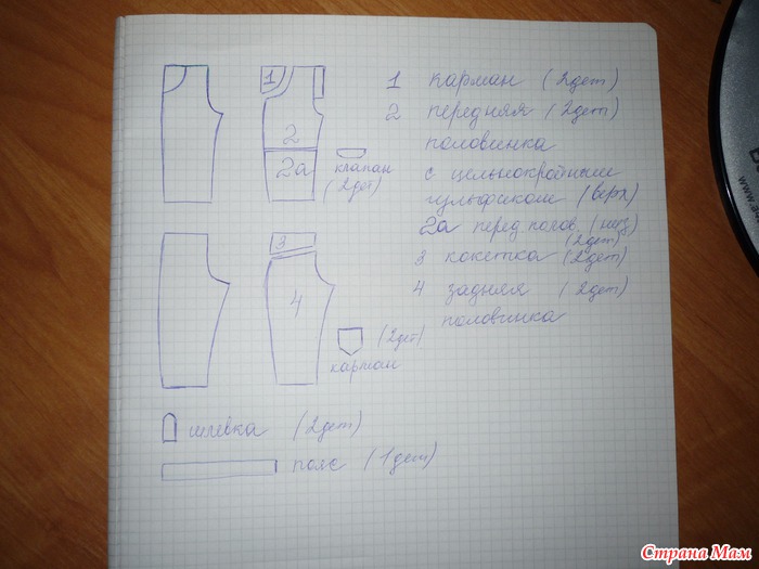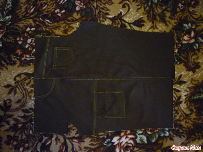 1. Обрабатываем срез карманов (деталь 1). Закрепить наметкой на изнаночную сторону подгиб карманов верха передних половинок, прогладить (деталь 2). Приметать верхнюю часть переда к карману и проложить двойную строчку.