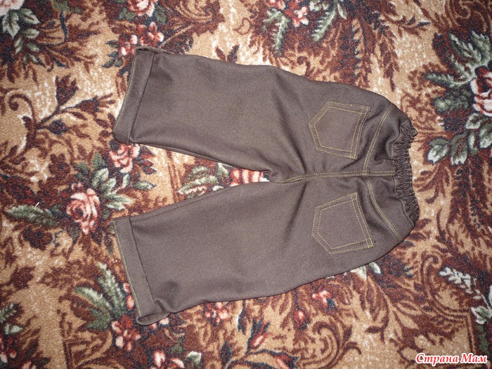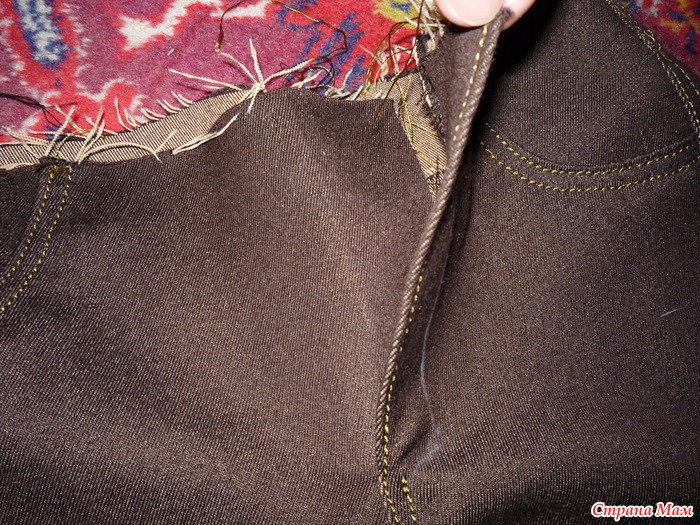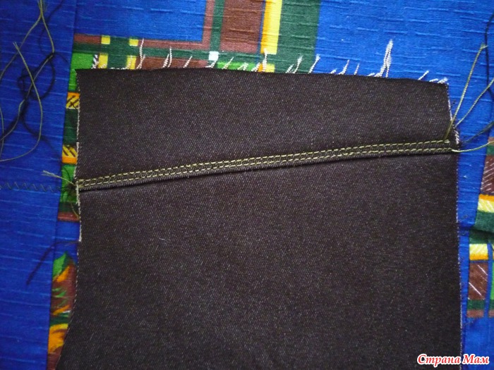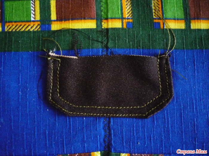 6. Шьем карман, приметываем припуски на изнанку, верх кармана оформляем двойной строчкой, проглаживаем. Притачать на заднюю половинку брюк двойной строчкой.