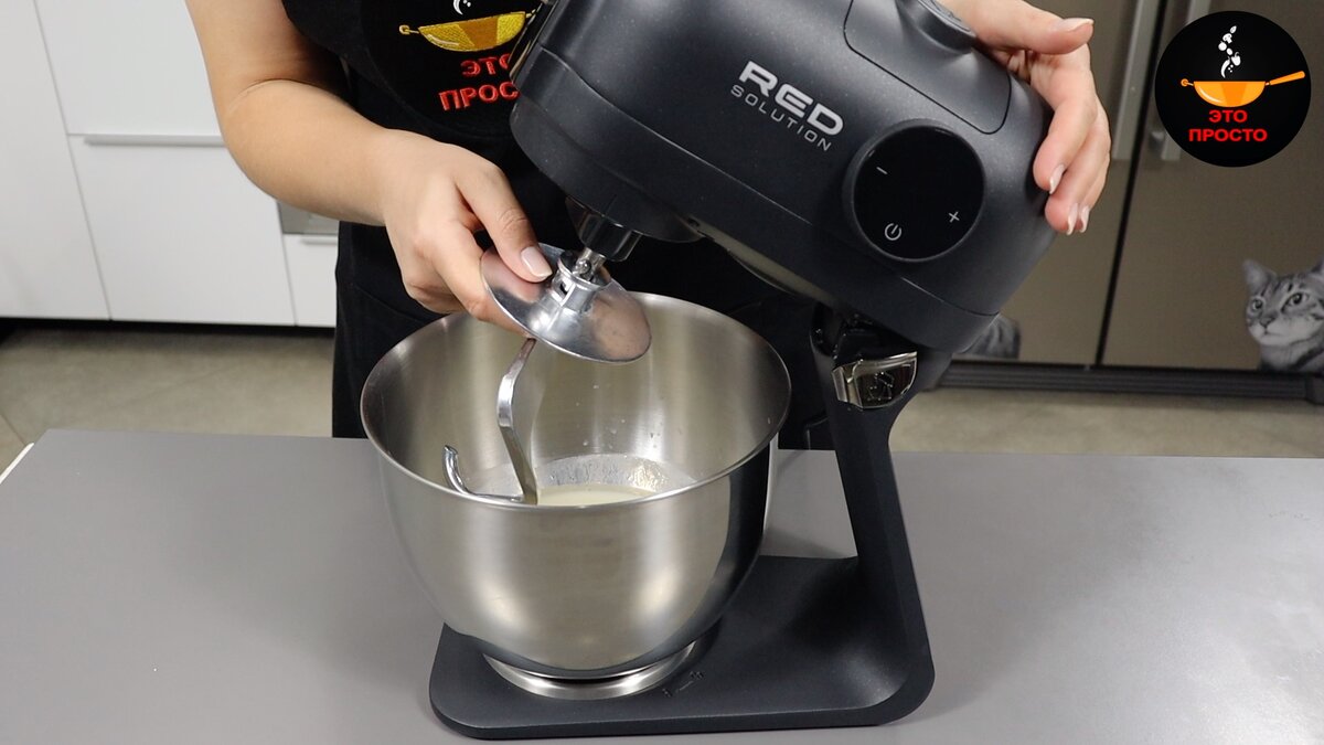 Желтки оставляем для обмазывания булочек, а белки добавляем в тесто и ещё выливаем 90 мл растительного масла без запаха. Чашу устанавливаем на миксер и замешиваем тесто с помощью насадки крюк. Я делаю это на средней скорости миксера.