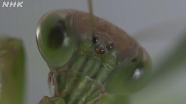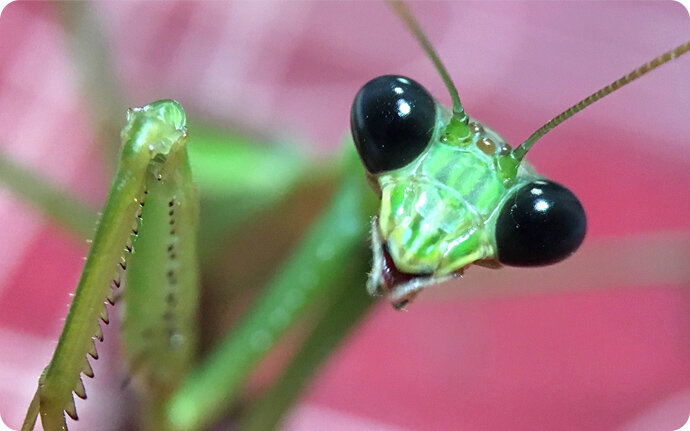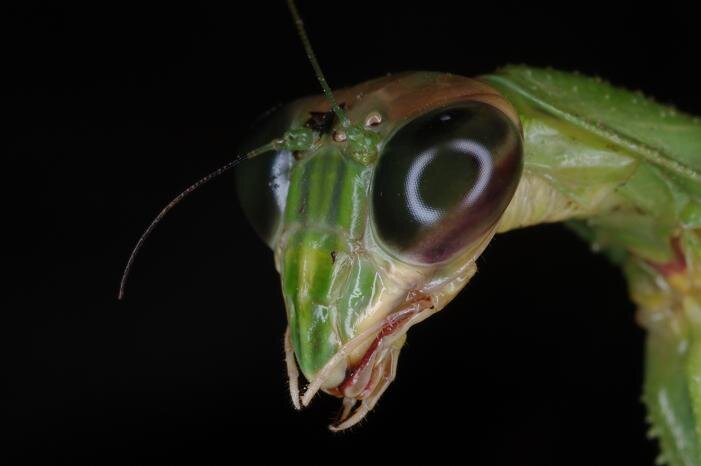 Понятно, что такому хищнику как богомол, при охоте необходимо быть точным в определении дистанции до цели. Ведь камакири доступна лишь одна попытка! Но все предусмотрено - глаза насекомого имеют особое строение, позволяющее точно оценивать расстояние, он имеет: 2 фасеточных глаза и 3 монокуляра. Морда богомола с 2 большими фасеточными глазами хорошо двигается вверх и вниз, влево и вправо. В фасеточном глазу есть черная точка, называемая ложным зрачком. Между фасеточными глазами - 3 монокуляра - они ощущают яркость.