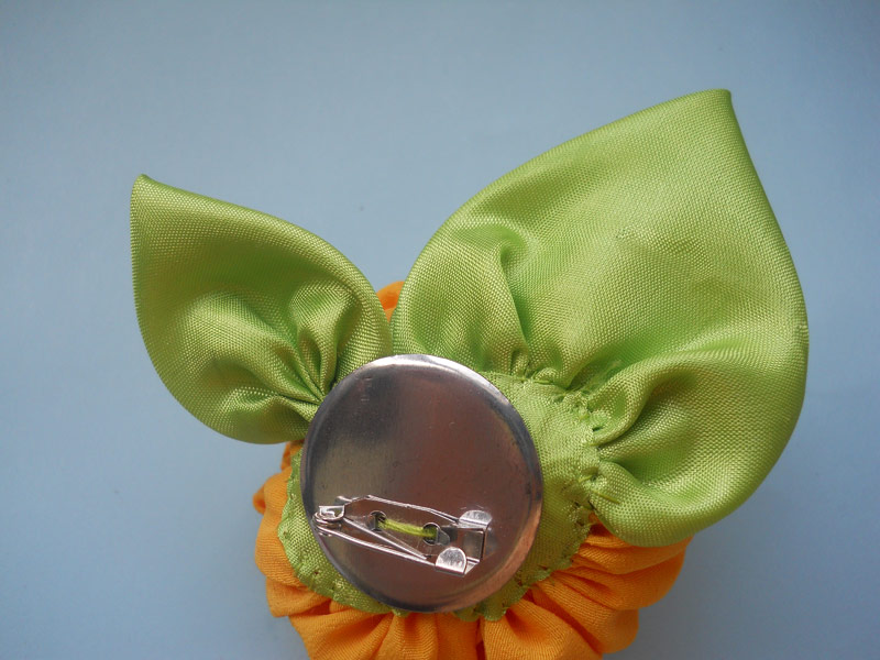 10. Листочки закрепляем на обратной стороне гортензии. Сверху пришиваем кружок потайным швом, подворачивая края внутрь. Пришиваем булавку для брошки.