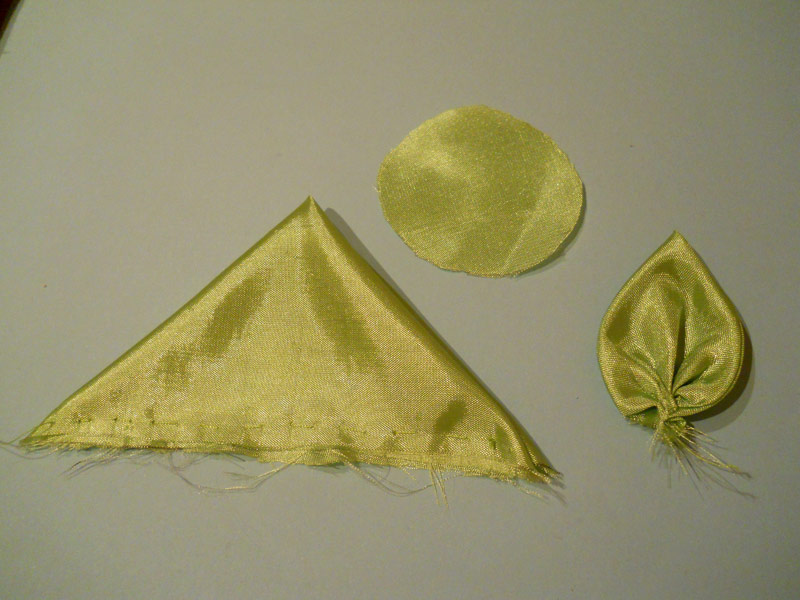 9. Берем два квадрата зеленой ткани: 12 х 12 см и 8 х 8 см. Каждый квадрат складываем по диагонали. Полученный треугольник складываем пополам. Открытые срезы треугольника, взятые вместе, присобераем на нить и стягиваем. Вырезаем кружок диаметром 5 см из зеленой ткани.