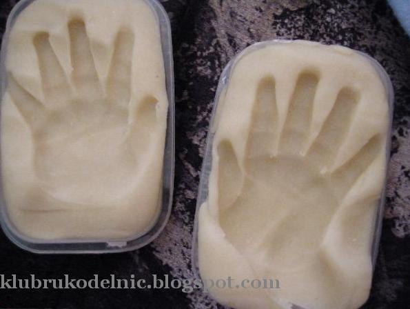 2. Ну а теперь самая трудная часть - сделать оттиск ручки или ножки ребеночка. Желательно, чтобы оттиск был глубиной минимально 7 мм, можно и глубже. Если с первого раза не получится, ничего страшного, выньте массу, помесите ее и опять положите в формочку. Оттиск делается в такой очередности: сначала основание ладошки, потом ладошка, потом каждый пальчик, если начнете оттиск с пальчиков, он не получится.