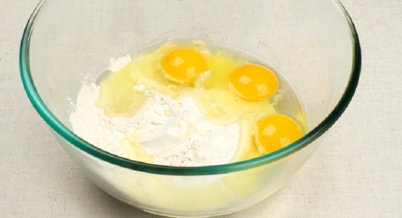 Для теста смешай яйца, муку, сахар и соль.