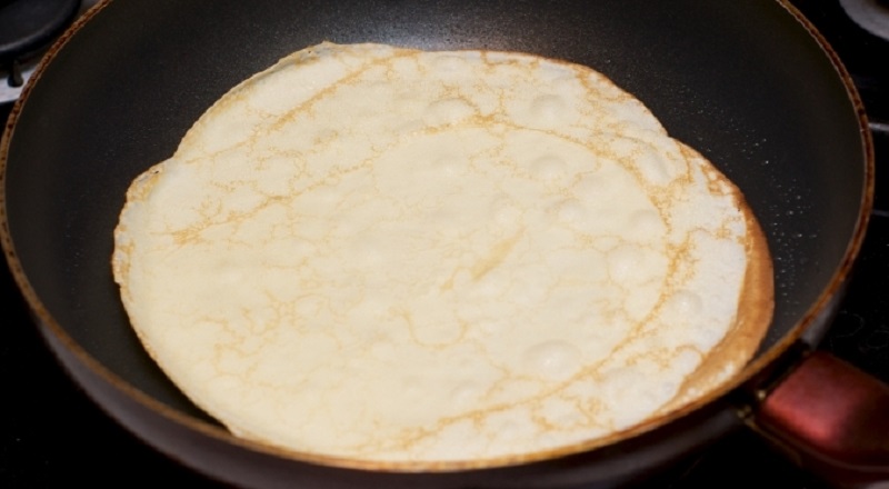 Для приготовления блинов лучше использовать не современную сковороду с антипригарным покрытием, а чугунную, с толстым дном. Следует ее хорошенько прокалить с помощью соли. Через 5 минут можно протереть сковороду сухой тряпочкой и приступать непосредственно к выпечке блинов.