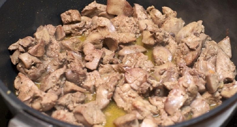 Обжарь куриную печень на сковороде до полной готовности, не забудь посолить мясо. Щепотки соли будет достаточно.