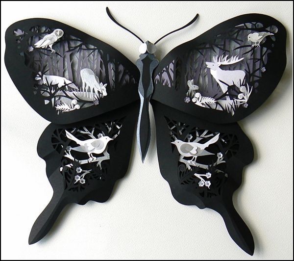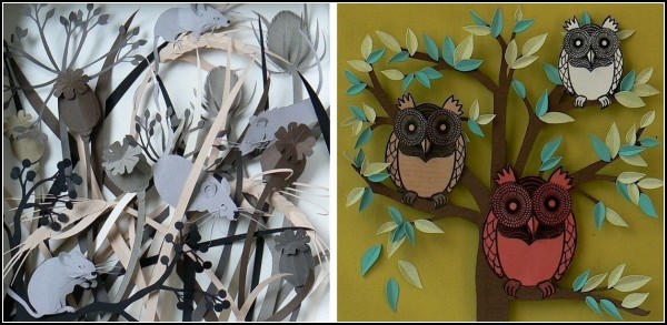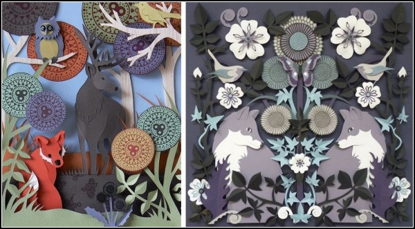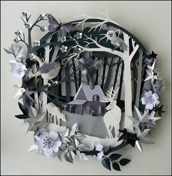 Картины, которые создает британская художница Хелен Массельвайт (Helen Musselwhite), больше похожи на маленькие сказочные миниатюры. Причем сказки очень добрые, спокойные и умиротворяющие, без погонь и взрывов, слез и разочарований, коварных ведьм и опасных злодеев. В бумажных мирах Хелен живут птицы и бабочки, пушистые лисы и благородные олени, глазастые совы и ушастые зайцы. Настоящий рай для любителей природы и родителей, которые воспитывают маленьких детей.