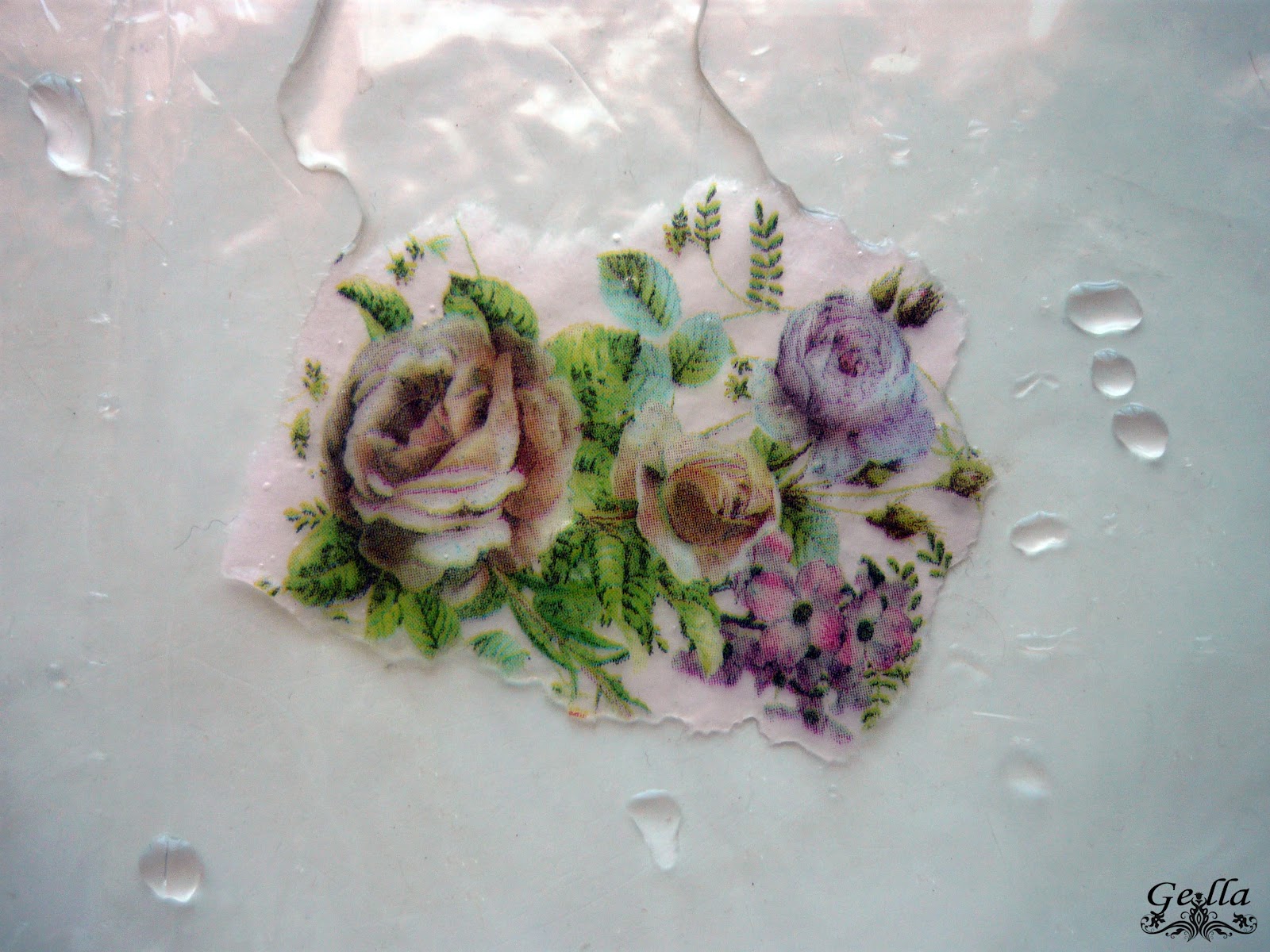 Кладём мотив лицевой стороной вниз на файлик и аккуратно, с руки, наливаем на него воды столько, чтобы мотив плавал на файлике. Под кран лучше не совать - может помять салфетку. Можно это делать из пульверизатора - получится ровнее и меньше пузырей. Далее быстро, лёгкими касаниями пальцев выгоняем пузыри воздуха из-под салфетки.