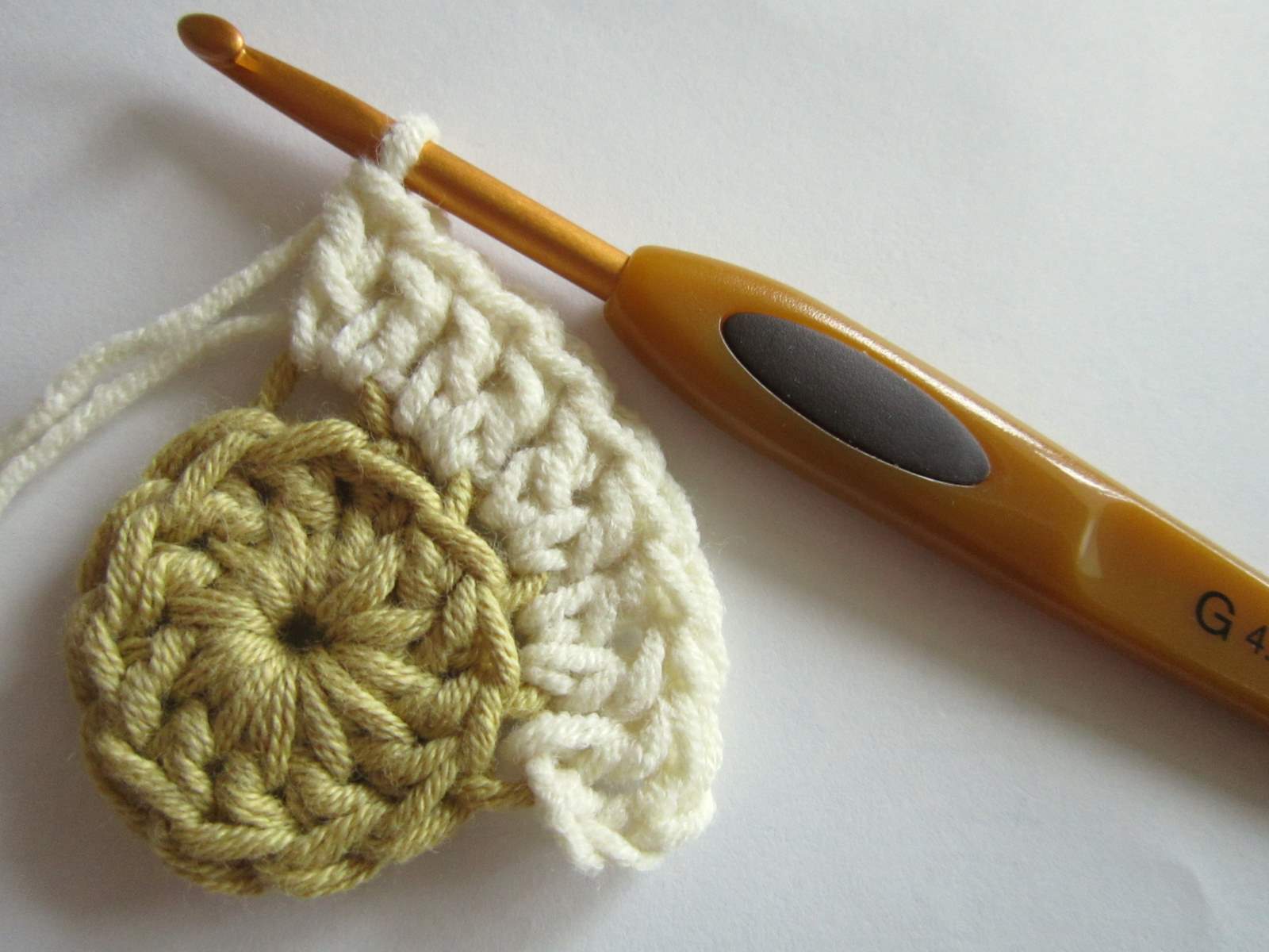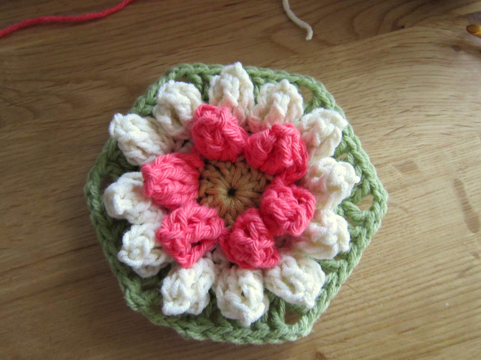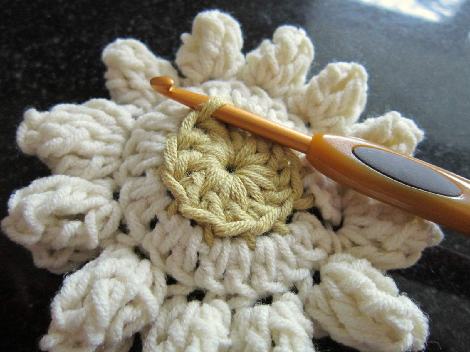 сли вы хотите сделать брошь или украсить сумку или подушку - работу можно считать законченной. 12. Но, чтобы связать шестиугольник, нужно провязать еще два ряда. Следующий ряд будем вязать за задние стенки петель (Помните, я писала, что мы возвратимся к ним)
