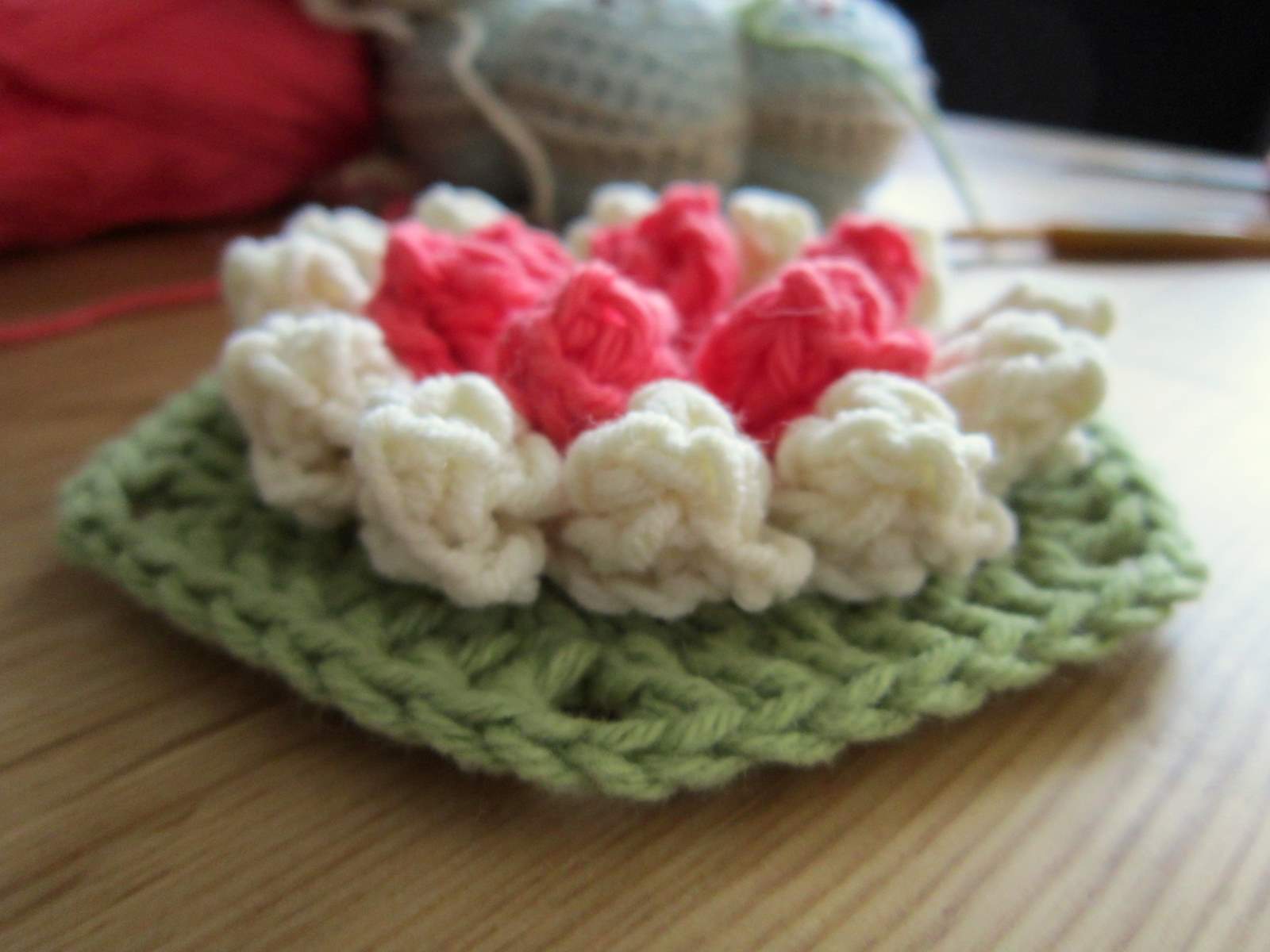 11. Осталось провязать внутренний ряд лепестков. Вставьте крюк в одном из передних петель 1-го ряда, и провяжите лепестки другим (у нас розовым) цветом.
