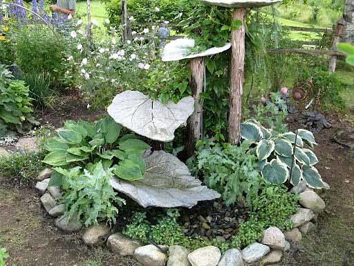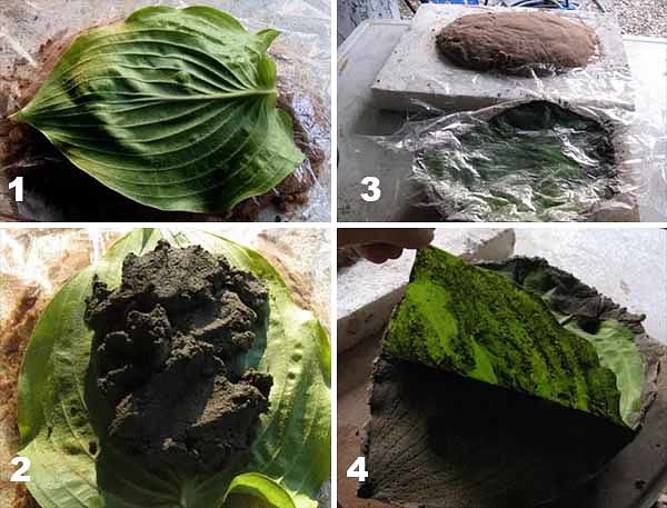 На горку песка уложить лист лопуха, хосты, гейхеры (что найдете) лицом вниз; сверху положить раствор цемента (следите, чтобы толщина была одинаковой везде); хорошо загладить, чтобы обратная сторона была красивой тоже; сушить 2-3 дня; убрать лопух с цемента; можно покрасить.