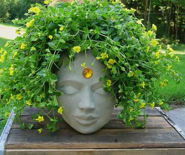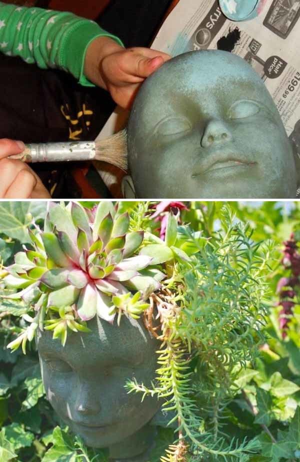Берем голову старой куклы; отрезаем верхушку; красим; заполняем грунтом; сажаем цветы.
